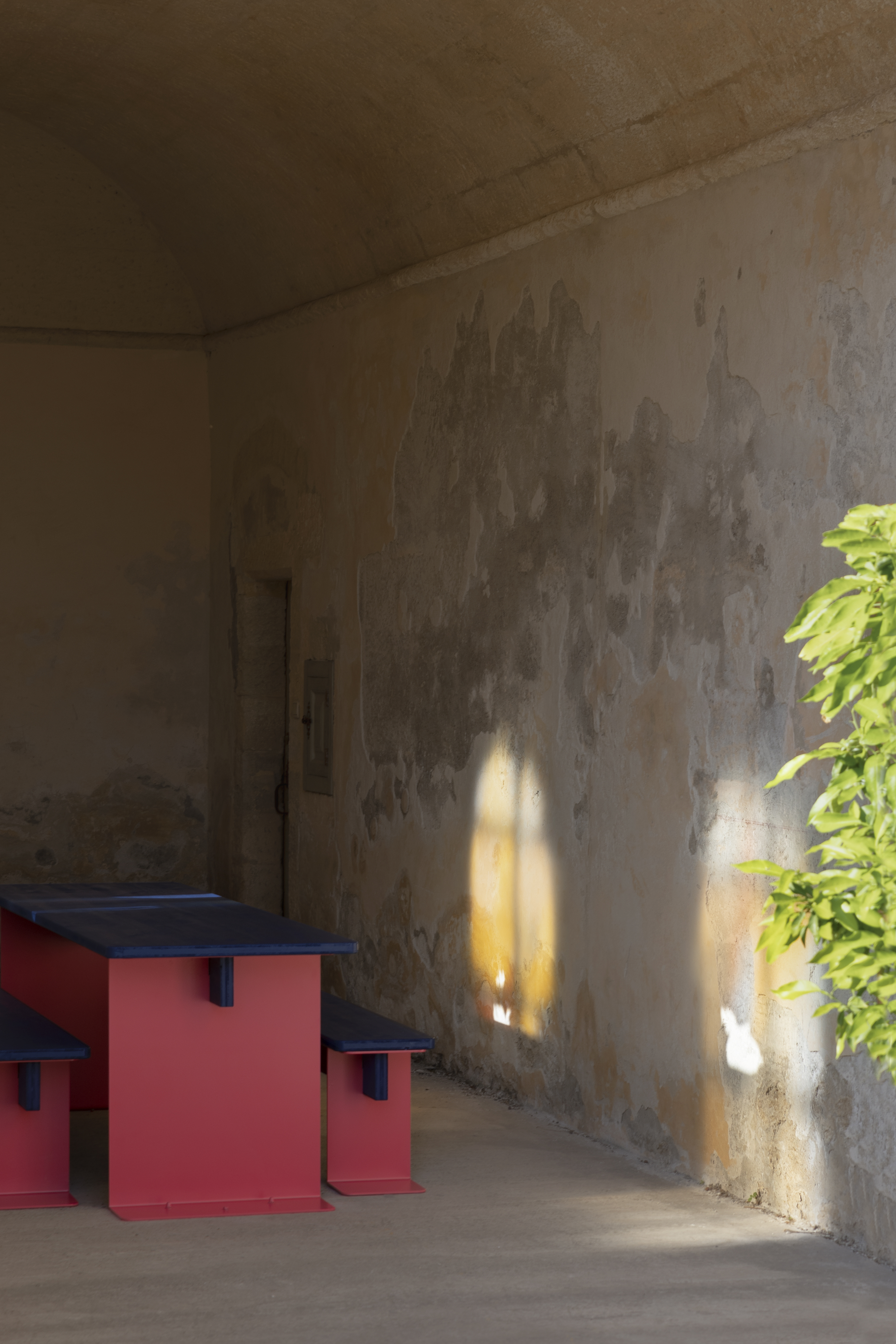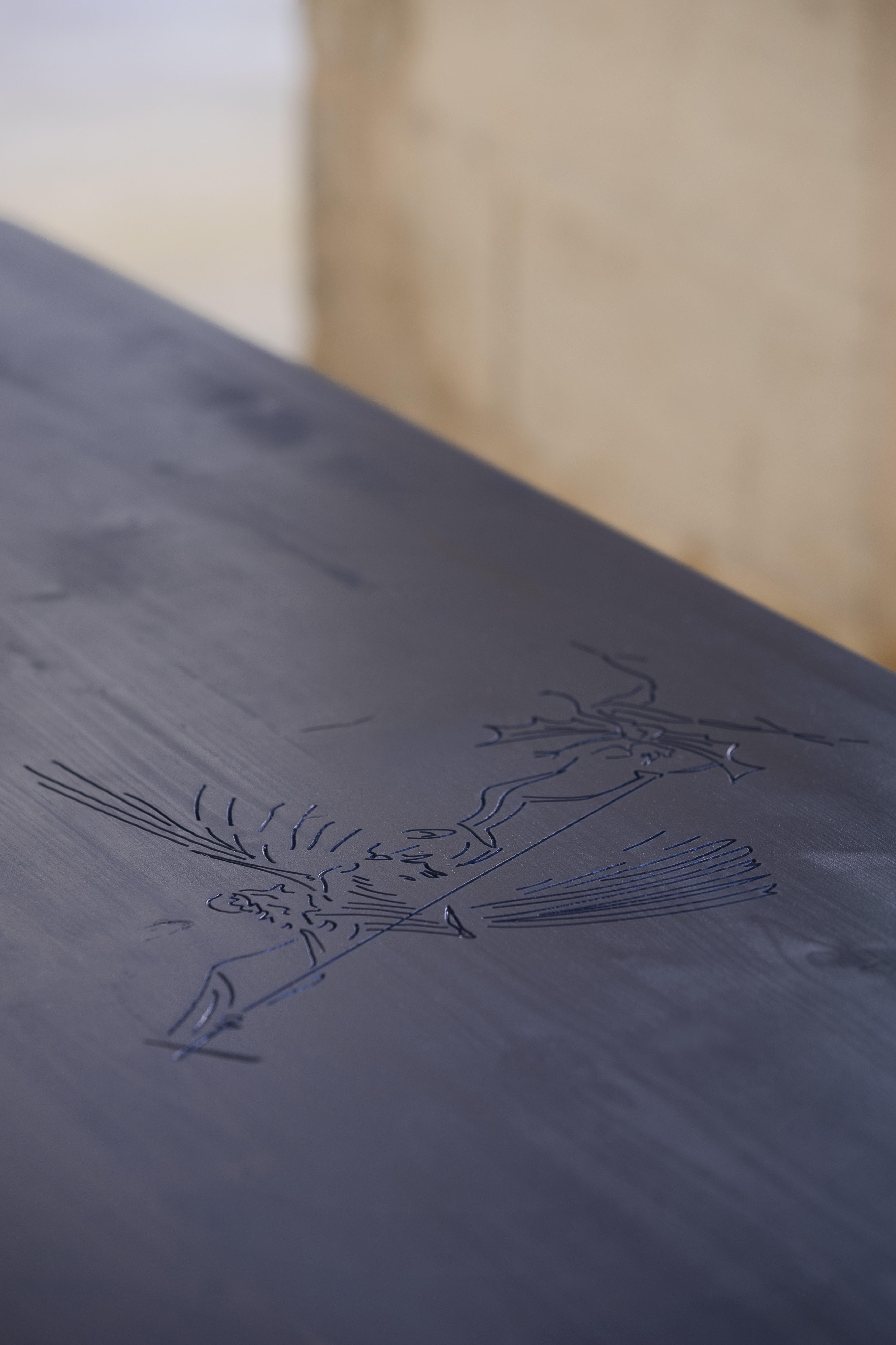 Trois tables et six bancs, aux plateaux bleu céleste, nous invitent à nous réunir, à faire communauté le temps d’un repas, d’une discussion, d’une rencontre, de débats. Les tables sont parcourues de gravures d’anges et de démons, seuls ou se battant pour des âmes. Elles sont des