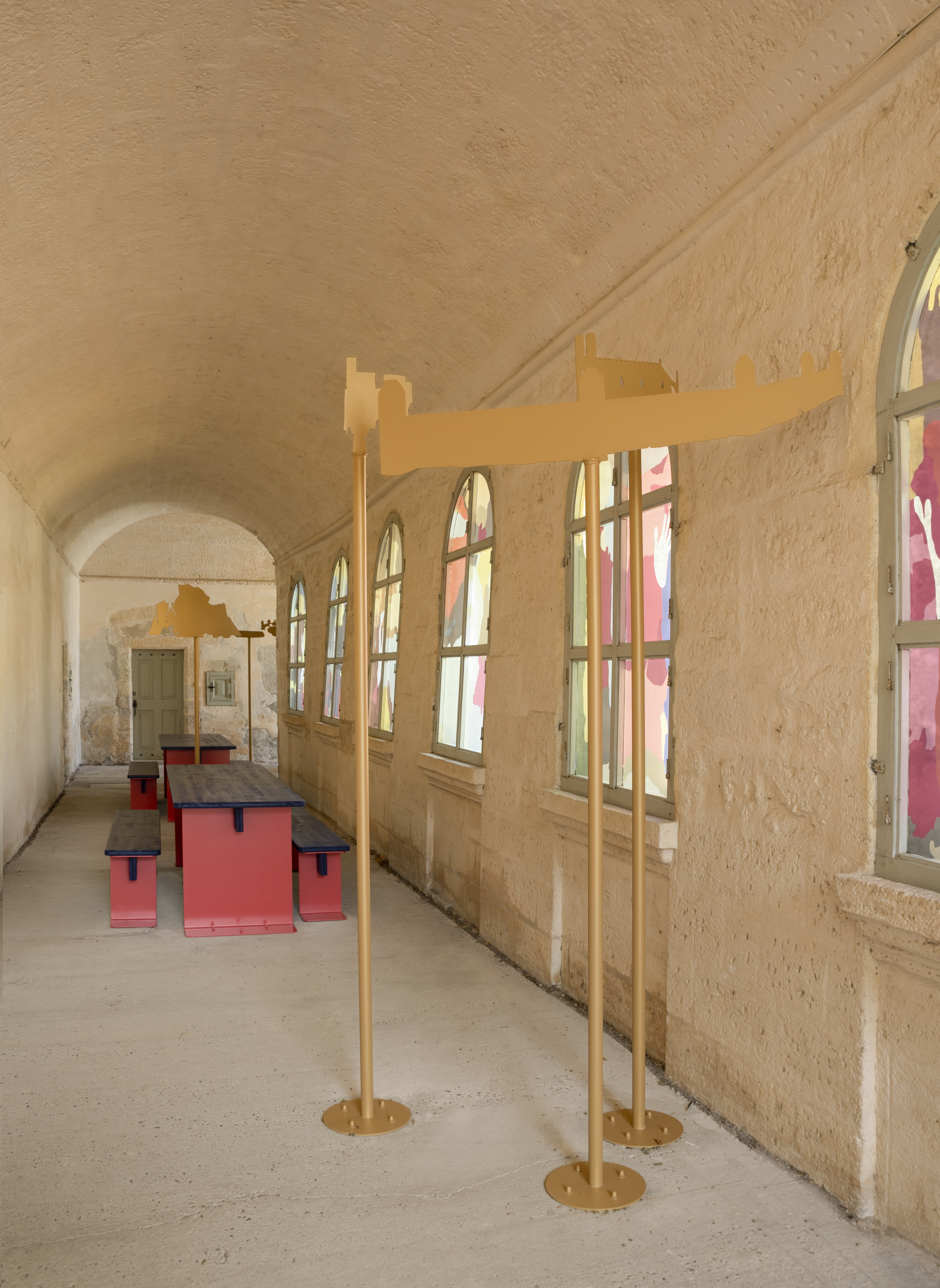 acier thermolaqué, bois gravé et peint, adhésif sur vitres