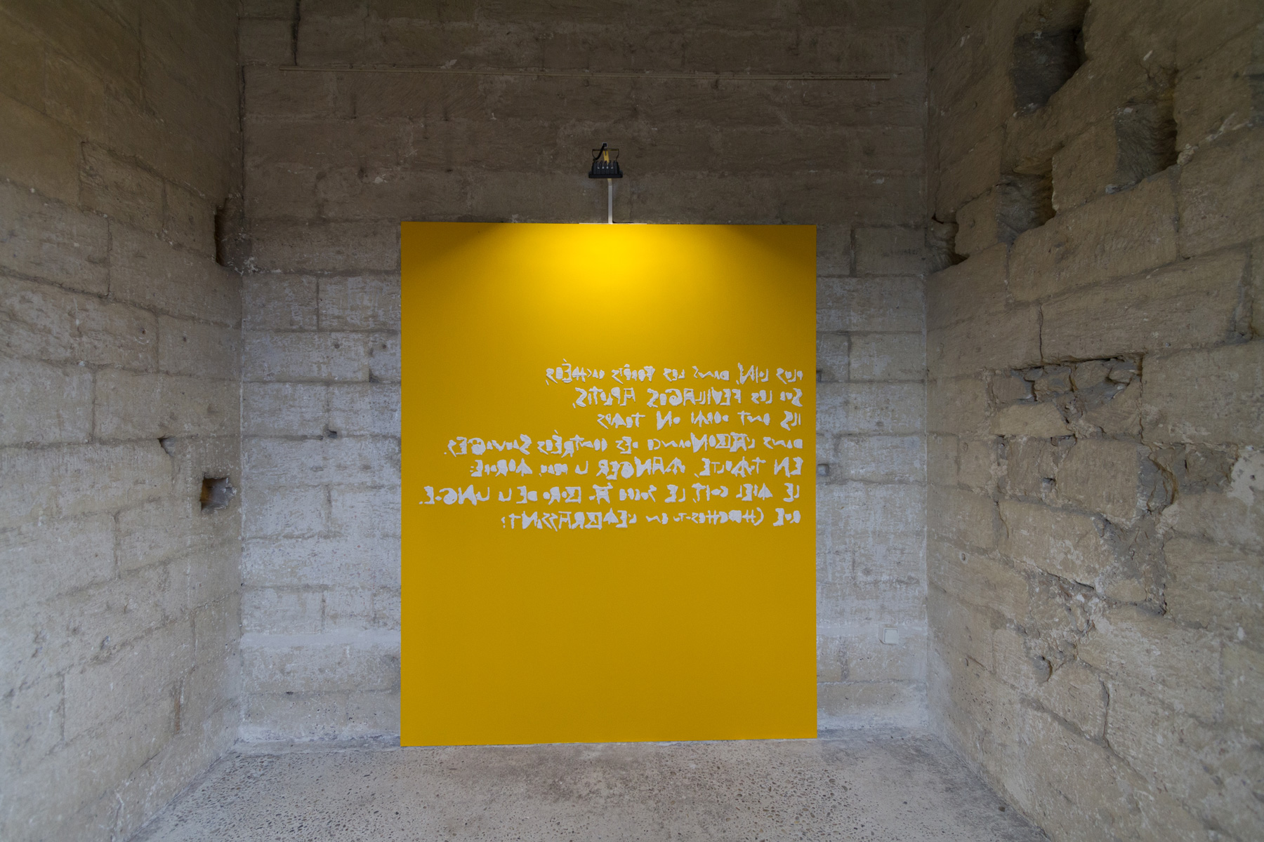 Ce poème en quatre strophes, écrit par Marguerite Foil pour l’exposition, se déploie à la Chartreuse et au musée Pierre-de-Luxembourg. Trois strophes sont écrites, ici, sur les murs de trois cellules et la dernière au musée.